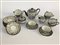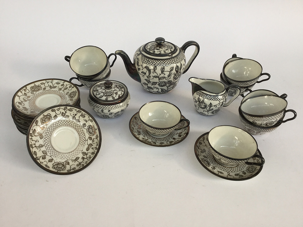 Manifattura tedesca, servizio da tè in porcellana con decori floreali argentati composto da undici tazze con piattini, teiera, lattiera e zuccheriera (difetti)