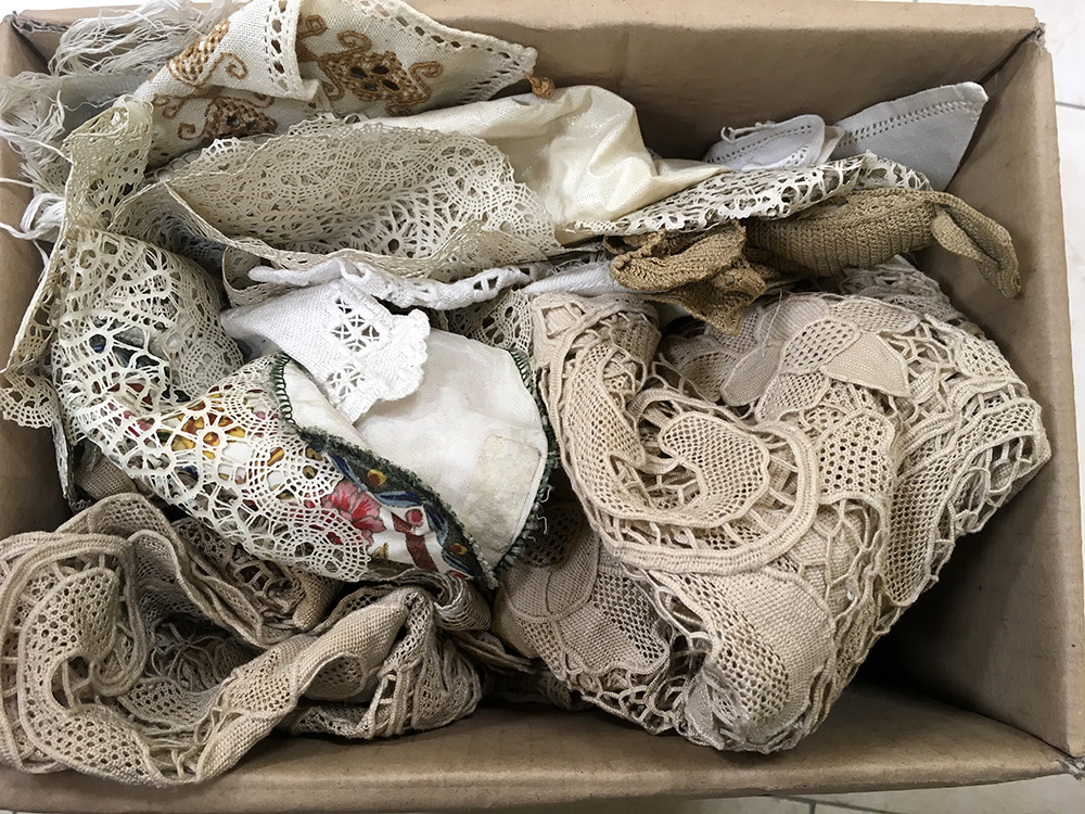 Cartone contenente numerose tovaglie e centrini (difetti)