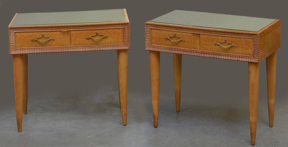 Due comodini impiallacciati in radica di legno chiaro con bordure intagliate a scanalature e maniglie in ottone, Italia, fine anni '40 (lievi difetti)