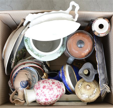 Manifatture diverseCartone contenente numerosi oggetti diversi in ceramica,...