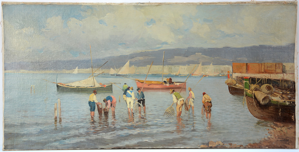 "Pescatori" olio su tela (cm 60x120) Firmato in basso a destra (difetti)