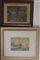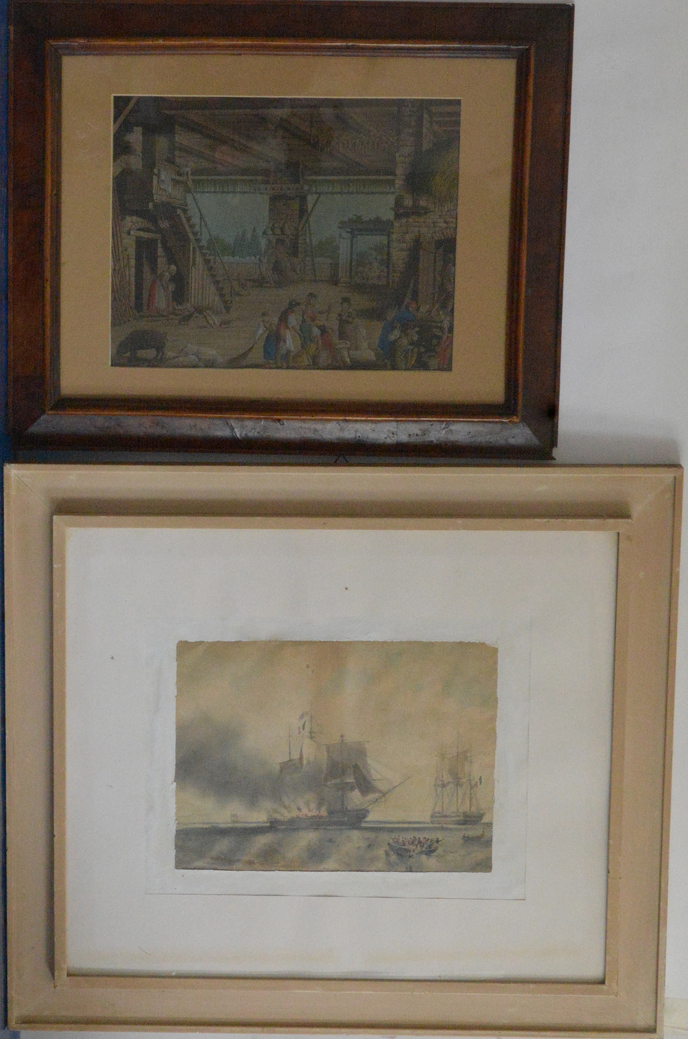 Lotto composto da un acquerello raffigurate velieri e una litografia a colori con scorcio di aia, in cornici (difetti)