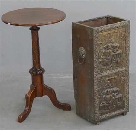 Lotto composto da un tavolino tripode ed un portaombrelli rivestito in metallo (difetti)