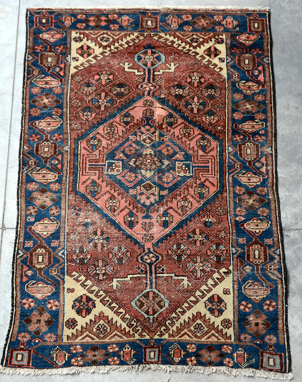 Tappeto Hamadan, Persia secolo XX. Decoro con medaglione esagonale rosa su fondo bordeaux chiaro (cm 164x100) (difetti)