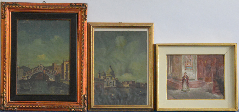 Lotto di tre dipinti raffiguranti scorci veneziani e interno di chiesa, autori e misure differenti, in cornici (difetti)