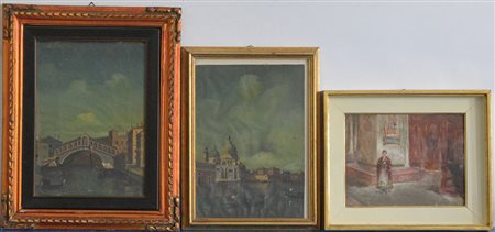 Lotto di tre dipinti raffiguranti scorci veneziani e interno di chiesa,...