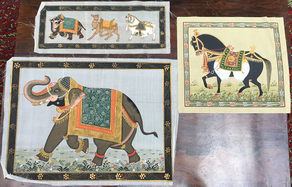 Tre dipinti policromi su tessuto raffiguranti animaliArea indiana, sec. XX...