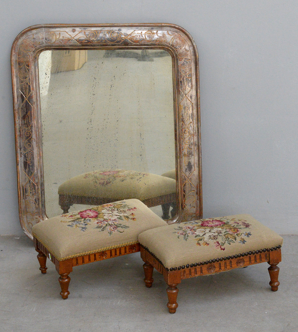 Lotto composto da una specchiera del secolo XIX e due poggiapiedi di forme diverse (difetti)