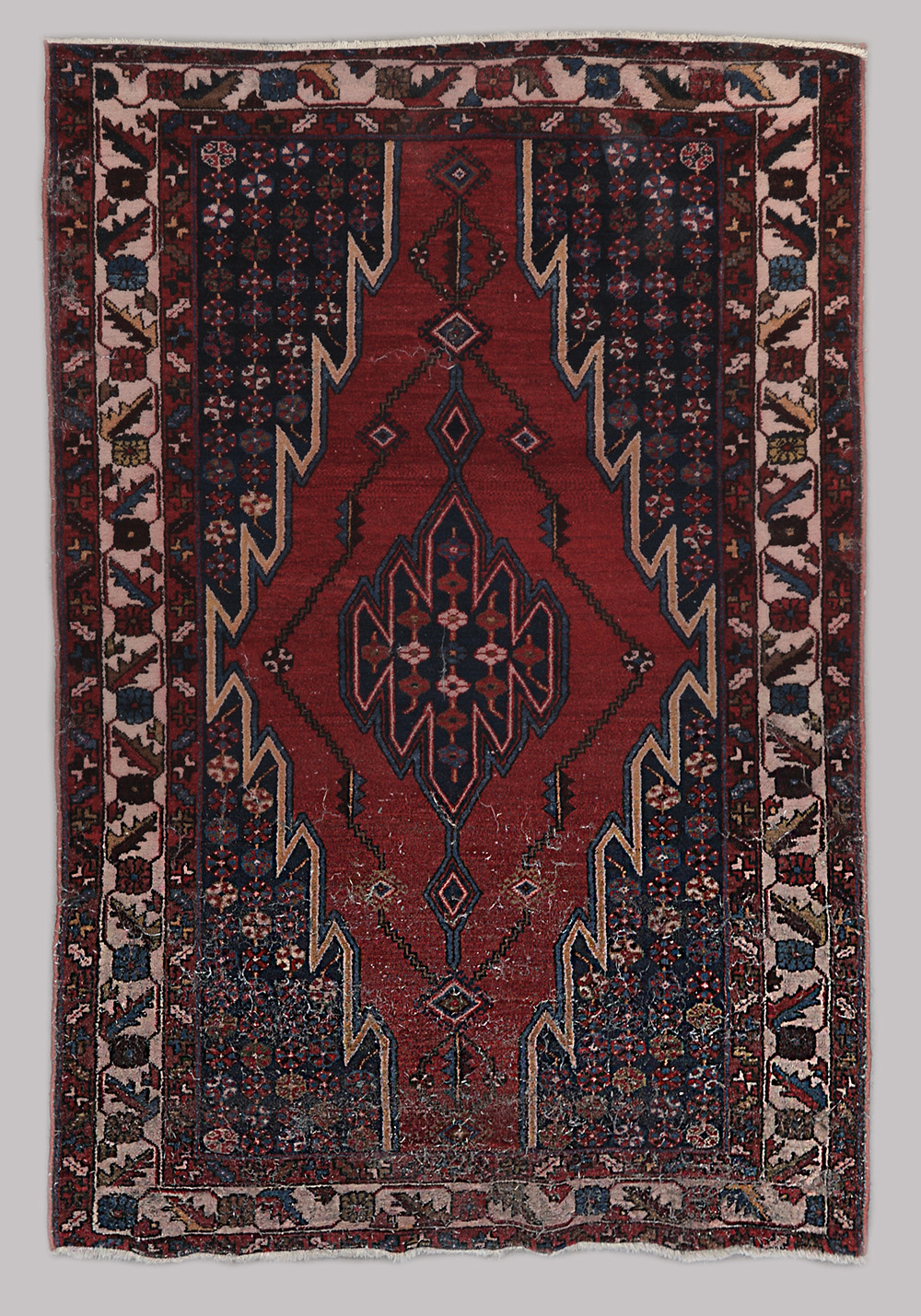 Tappeto Mazlagan, Persia secolo XX. Disegno a medaglione con puntali su fondo rosso (cm 200x132) (difetti e rapature)