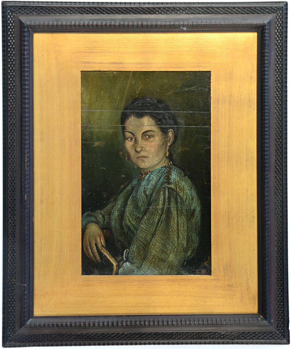 Firma indecifrata "Ritratto di signora" olio su tela applicata a compensato (cm 54x35) In cornice (difetti e restauri)