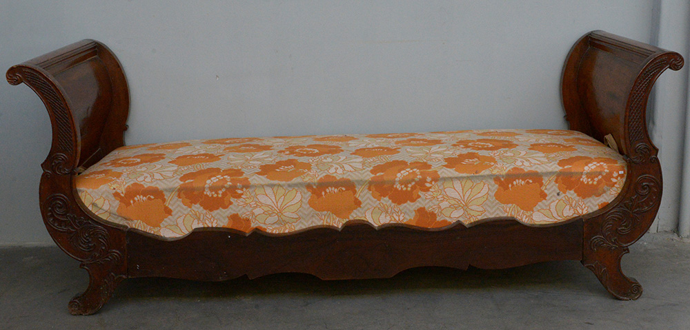 Divanetto in noce con maontati sagomati ed intagliati a motivi vegetali, secolo XIX (difetti, fascia inferiore non coeva)