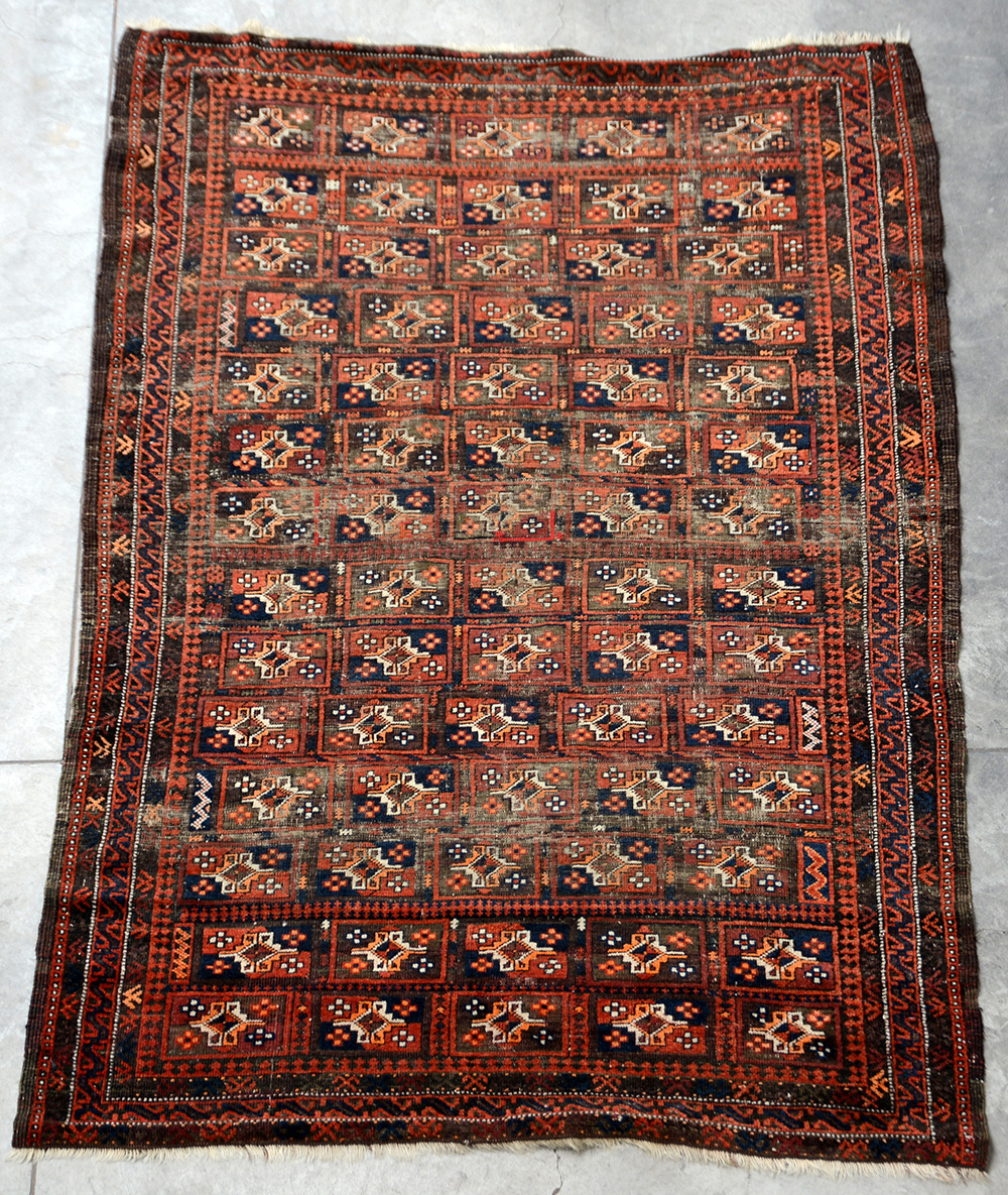 Tappeto Beluchistan, Persia inizio secolo XX. Disegno "all-over" con piccoli Gul entro rettangoli a quattro quadranti nei toni del bianco, albicocca, rosso, blu e marrone (cm 179x121) (difetti e rapature)