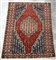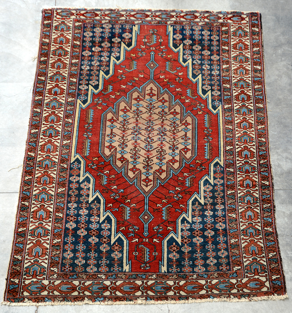 Tappeto Mazlaghan, Persia inizio secolo XX. Decoro con medaglione color cammello su campo color rosso e angolari blu (cm 191x131) (difetti)
