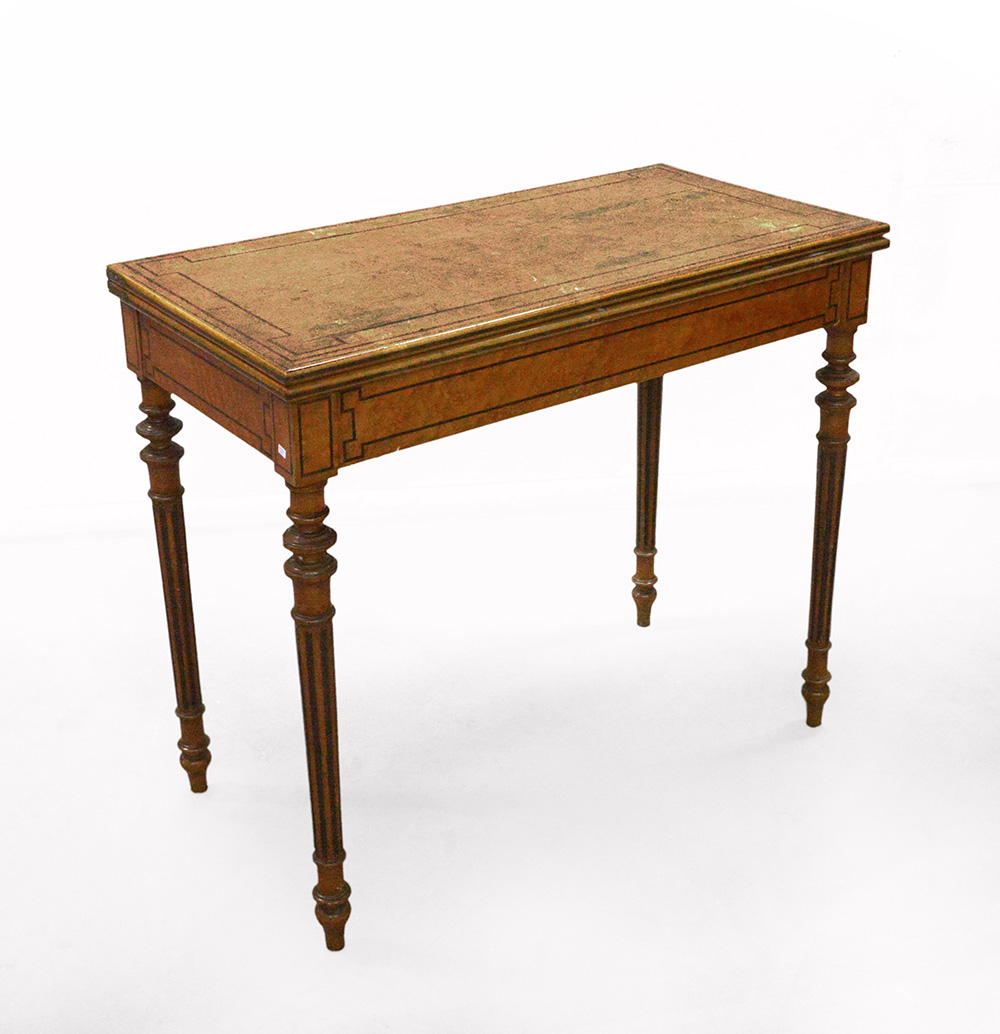 Tavolino da lavoro con piano a libro lastronato e filettato, gambe tornite e scanalate, secolo XIX (cm 92x78x46) (difetti)