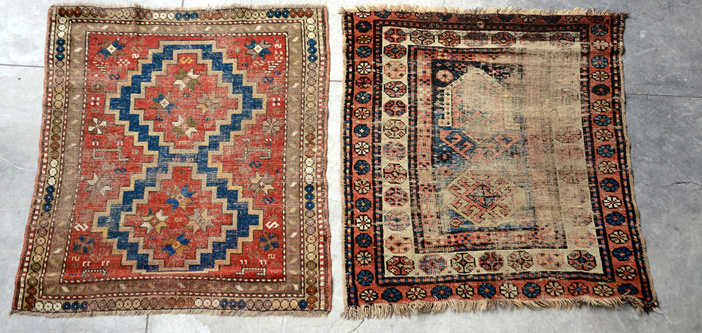Lotto di due tappeti caucasici Gandjié, inizio secolo XX (cm 100x82; cm 97x85) (difetti e rapature)