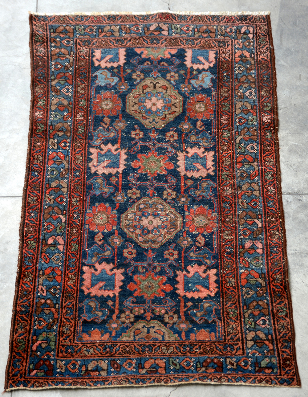 Tappeto Hamadan, Persia inizio secolo XX. Disegno con piccoli medaglioni policromi su fondo blu (cm 171x103) (difetti e mancanze)