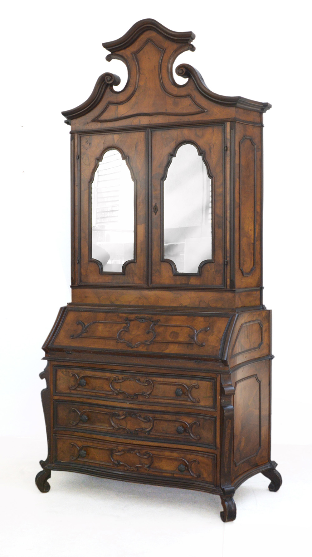 Mobile lombardo a due corpi in stile settecentesco, lastronato in radica di noce con fronte lievemente mossa a tre cassetti, ribalta celate cassettini e vani a giorno, parte superiore a due sportelli con specchi (cm 120x247x50) (difetti)