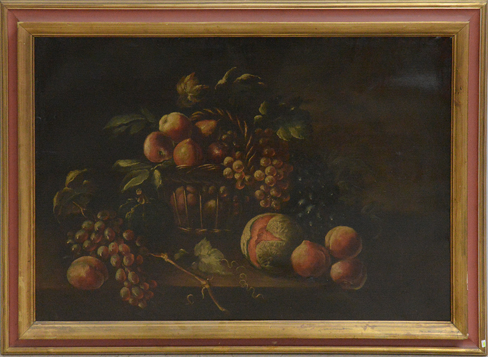 Ignoto, "Natura morta con frutta", olio su tela (cm 70x100), secolo XX, in cornice (difetti e restauri)