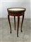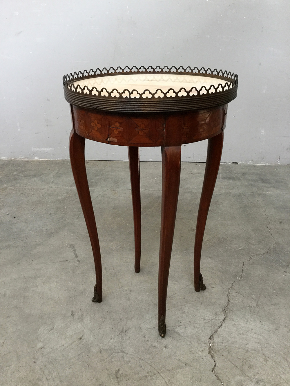 Tavolino con gambe mosse e fascia intarsiata, piano in marmo e applicazioni in metallo (d cm 32, h cm 54) (difetti)