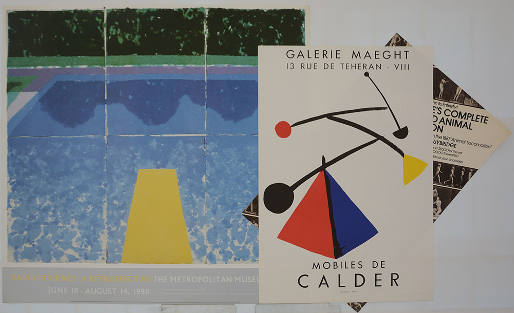 Lotto composto da numerosi manifesti espositivi di diverse misure tra cui uno della Galleria Maeght sui Mobiles di Calder, uno su Muybridge e uno sulla retrospettiva di David Hokney del 1988 al Met Museum