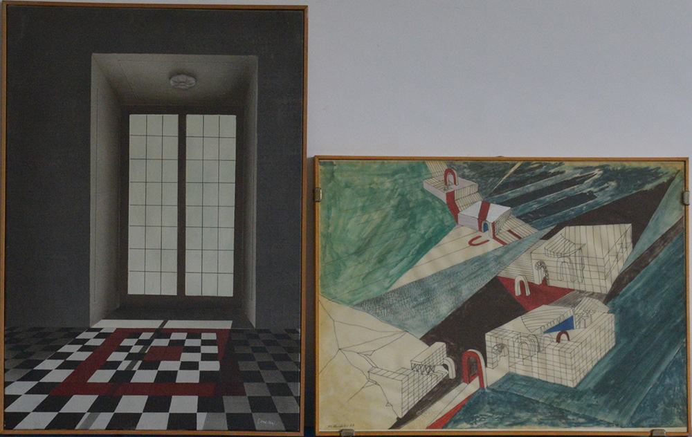 Lotto di due opere a soggetto architettonico su tela e carta da lucido,...