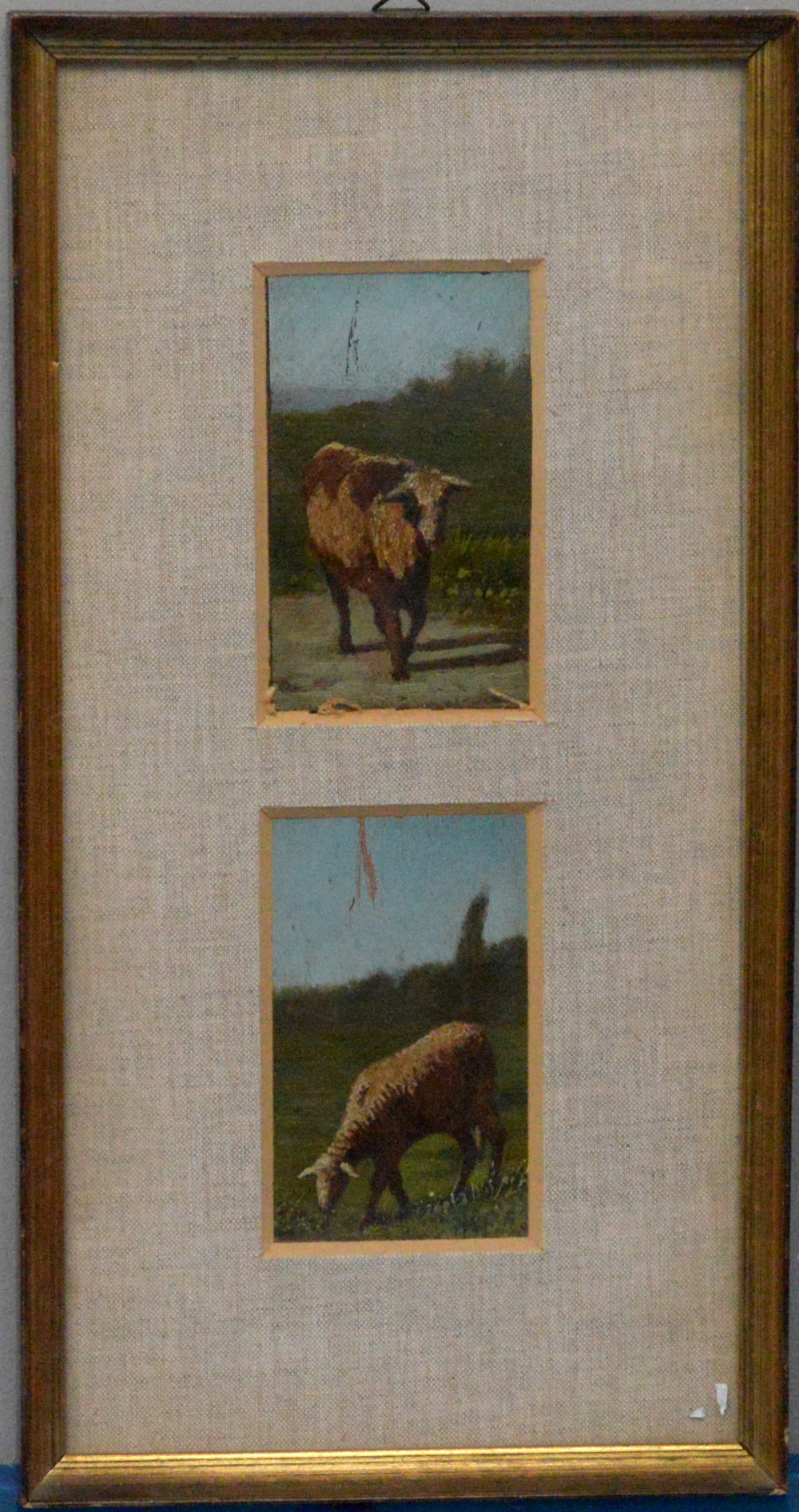 Scuola del secolo XIX "Pecore" coppia di dipinti ad olio su tavoletta (cm 10x6) cintenuti in un unica cornice (difetti)