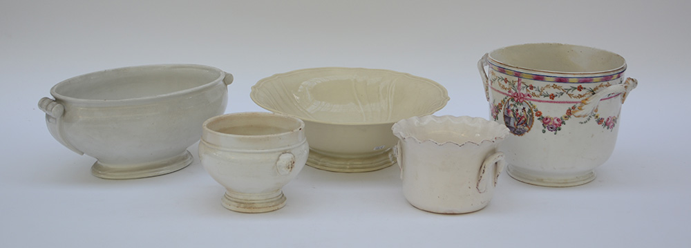 Lotto composto da due rinfrescatoi, due zuppiere e un'insalatiera in ceramica e porcellana di misure ed epoche diverse (difetti)