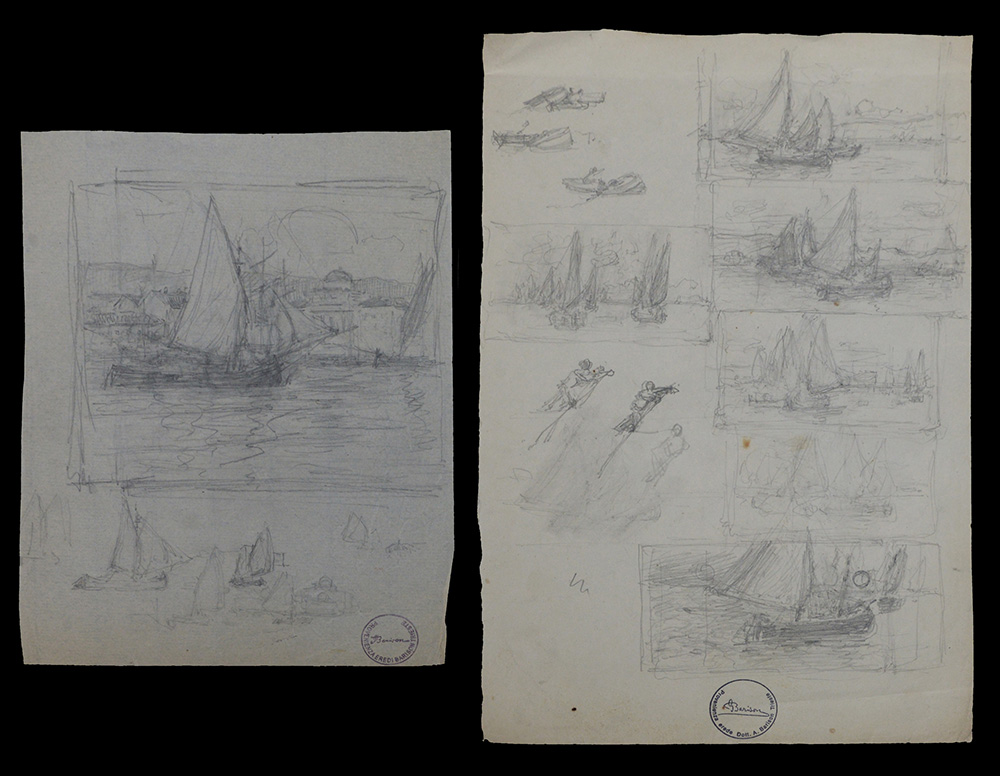 "Studio di marine" e "Verso Palazzo Carciotti, Trieste" due disegni a matita su carta (cm 27x20 e 22x17) Timbri degli eredi Barison, Trieste (difetti)