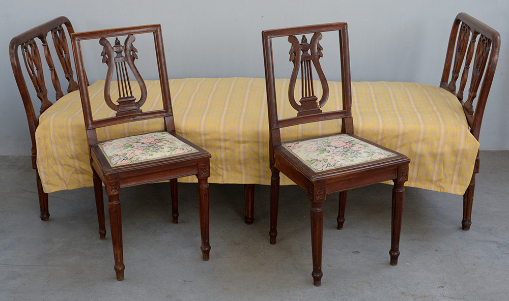 Lotto composto da un letto ad una piazza con testiera e pediera a ringhiera e una coppia di sedie Luigi XVI con schienale a giorno e sedute imbottite (difetti)