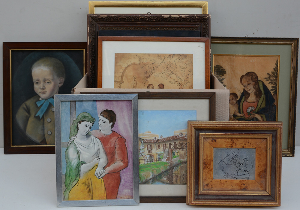 Cartone contenente numerosi quadri di soggetto, tecniche e dimensioni differenti, in cornici (difetti)