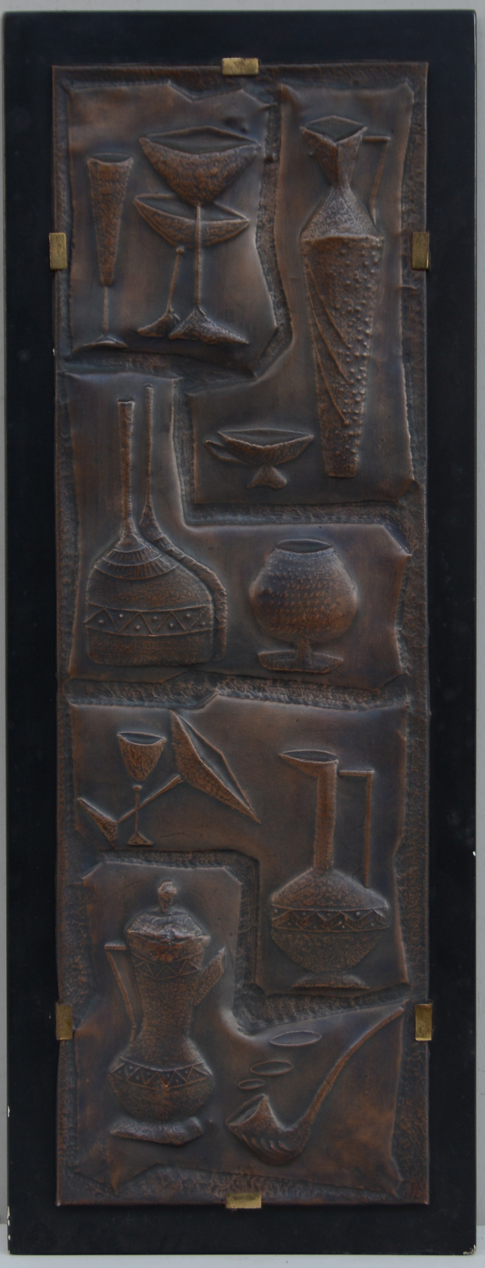 Ignoto, pannello in rame sbalzato raffigurante nature morte, montato su compensato (cm tot 71x27) (lievi difetti)