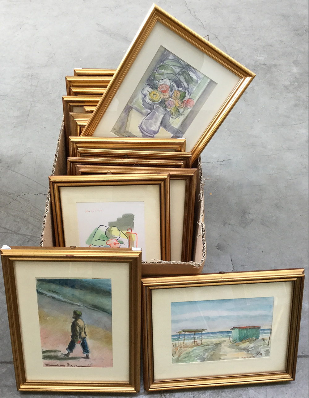Cartone contenente numerosi quadri di autori e tecniche differenti, in cornici (difetti)