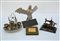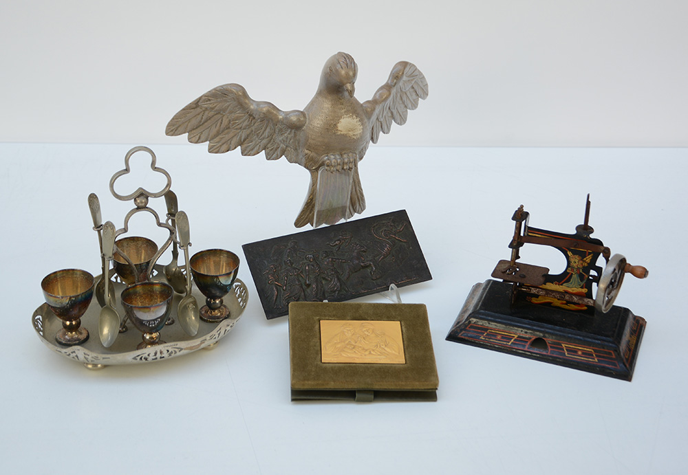 Lotto composto da un servizio portauova in metallo argentato, un piccolo bassorilievo in metallo raffigurante scena mitologica, una scultura di colomba in legno, una placca in metallo dorato firmata E. Manfrini raffigurante la sacra famiglia e una macchina per cucire giocattolo. (misure diverse) (difetti)