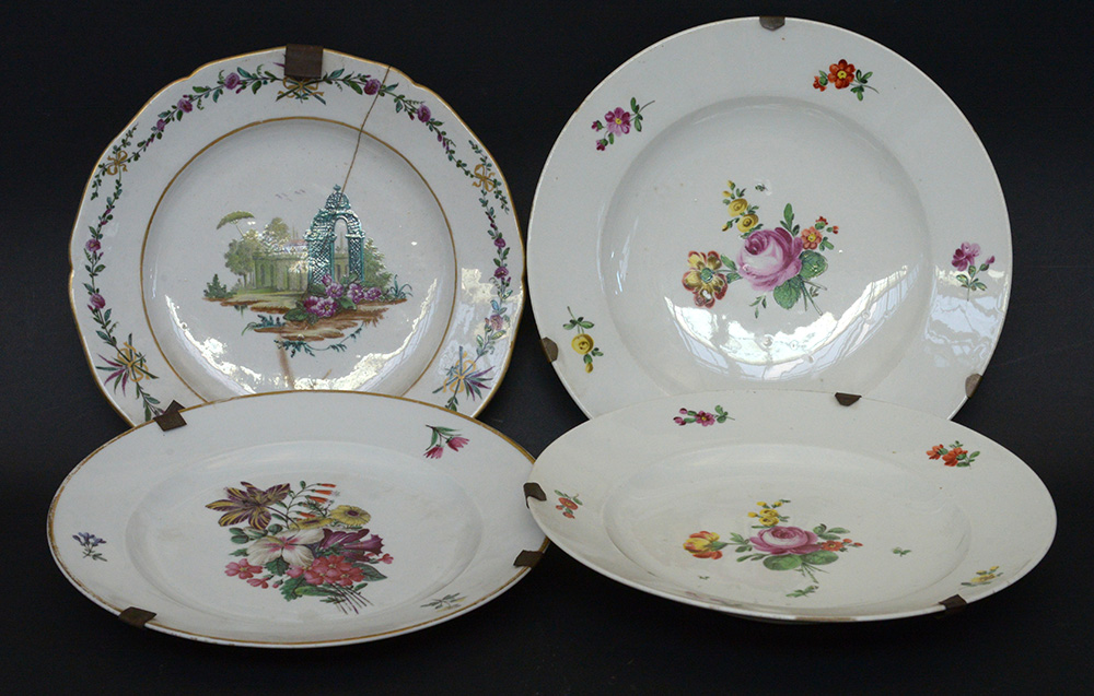 Lotto di quattro piatti in porcellana a decori naturalistici, manifatture di Vienna, Cozzi e anonimo, inizio secolo XIX (d max cm 24) (difetti e restauri)