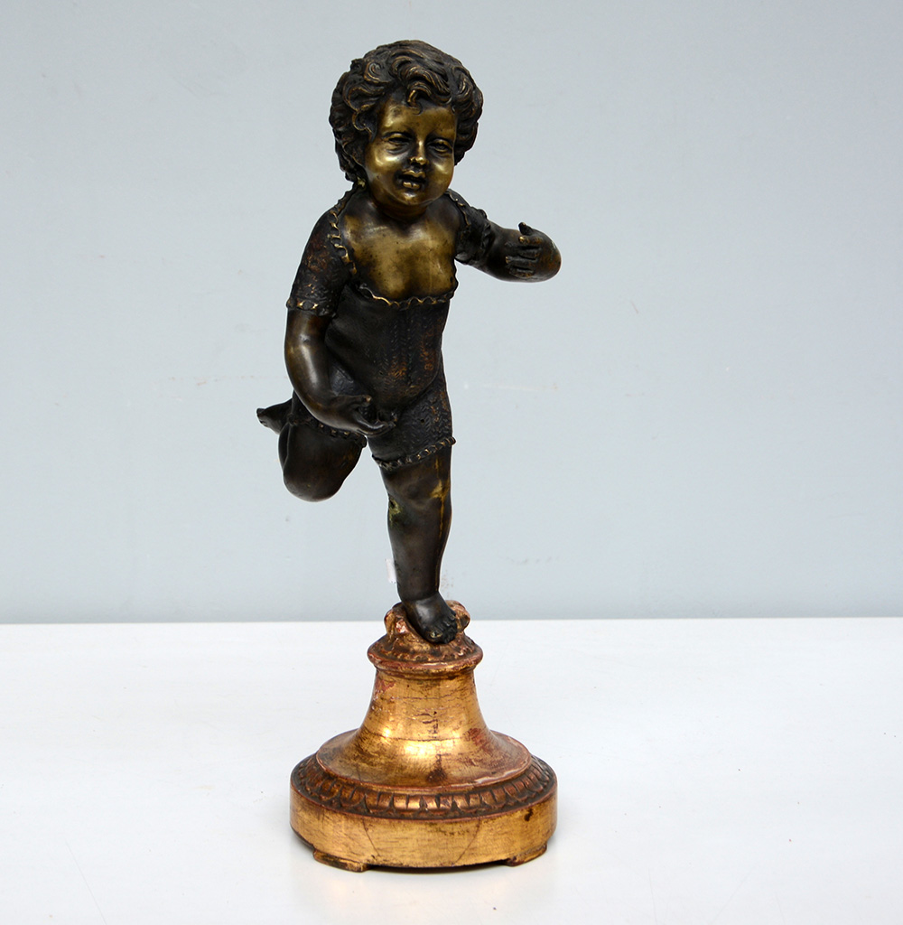 Scultura in bronzo raffigurante bambino (h. cm 33) Su base in legno tornito e dorato (difetti)