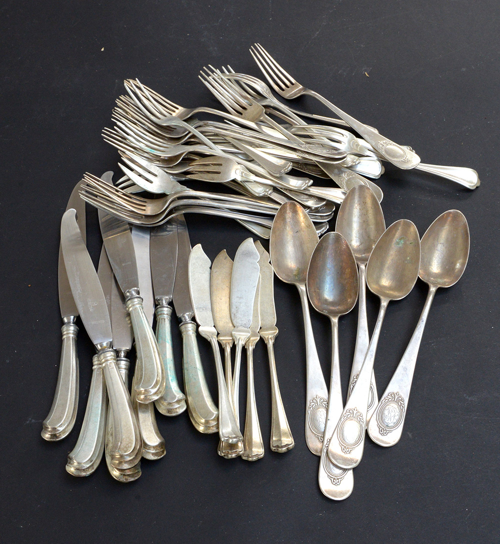 Lotto di posate diverse in argento composto da ventotto forchette, cinque cucchiai e cinque coltelli da dolce (gr 1480) uniti a otto coltelli con manici in argento (difetti)