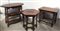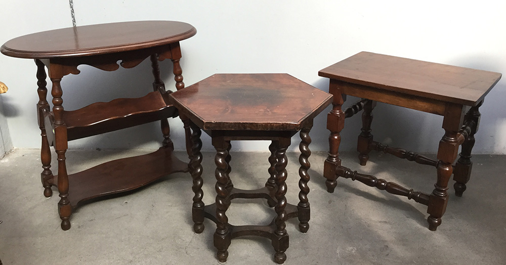 Lotto di tre tavolini con piani rettangolare, ovale ed esagonale, montanti torniti (h max cm 61) (difetti)