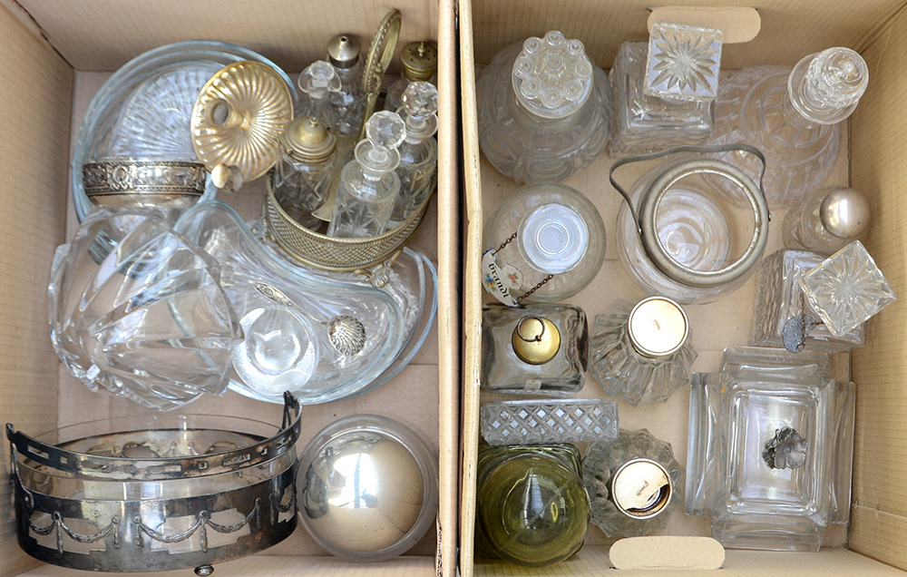 Lotto di due cartoni contenenti numerosi oggetti per la tavola in cristallo, alcuni con elementi in argento (difetti)