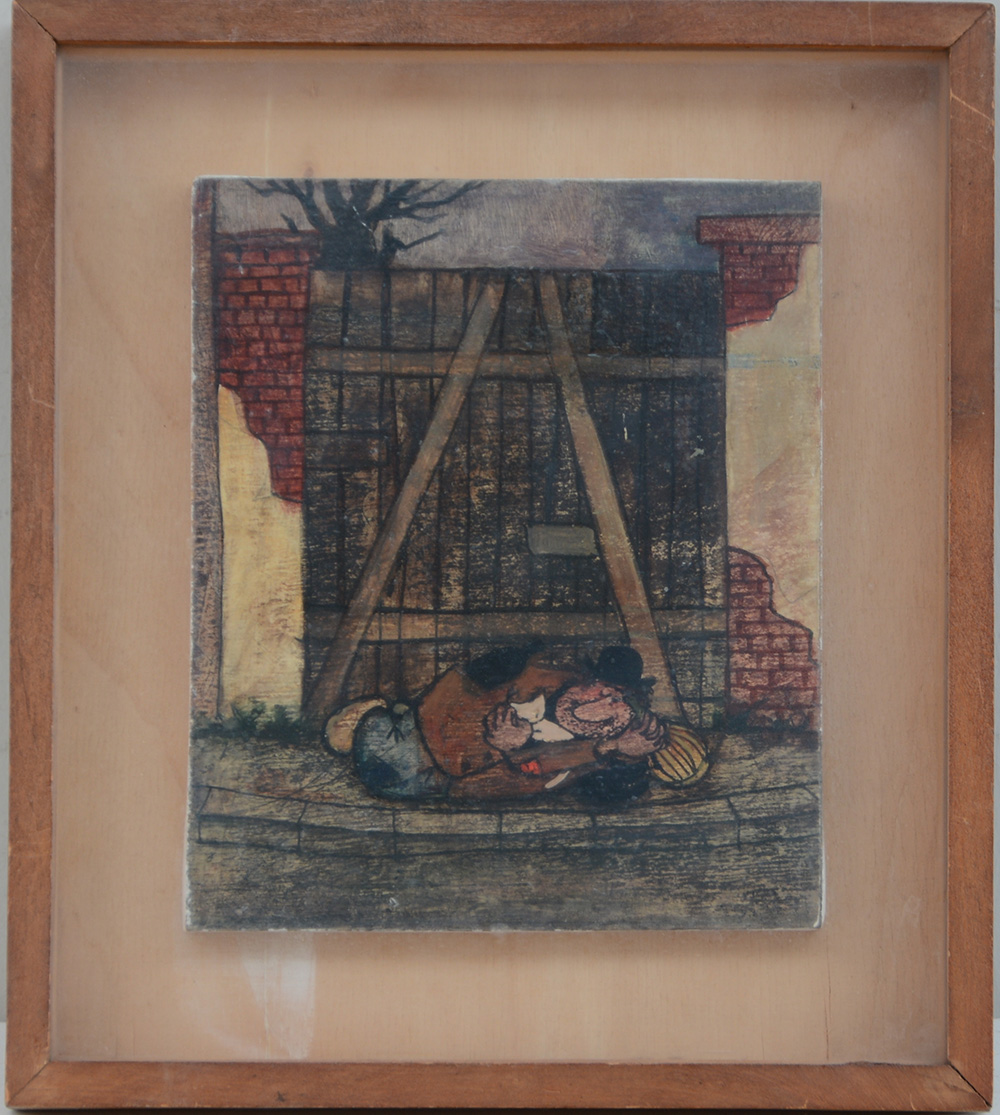 "Senza titolo", olio su compensato (cm 20x17) siglato in basso a destra, dedicato, firmato e datato 1957 al verso, in cornice (lievi difetti)