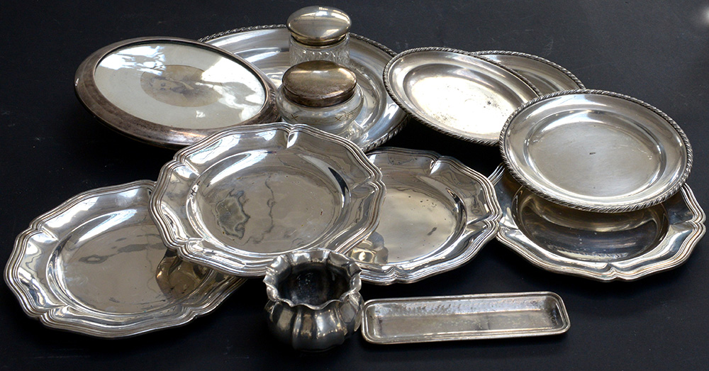 Lotto di argenti composto da : otto piatti, un portapenne ed un vasetto (gr 2400) uniti ad una cornice portafoto e due contenitori in argento, vetro e legno (difetti)