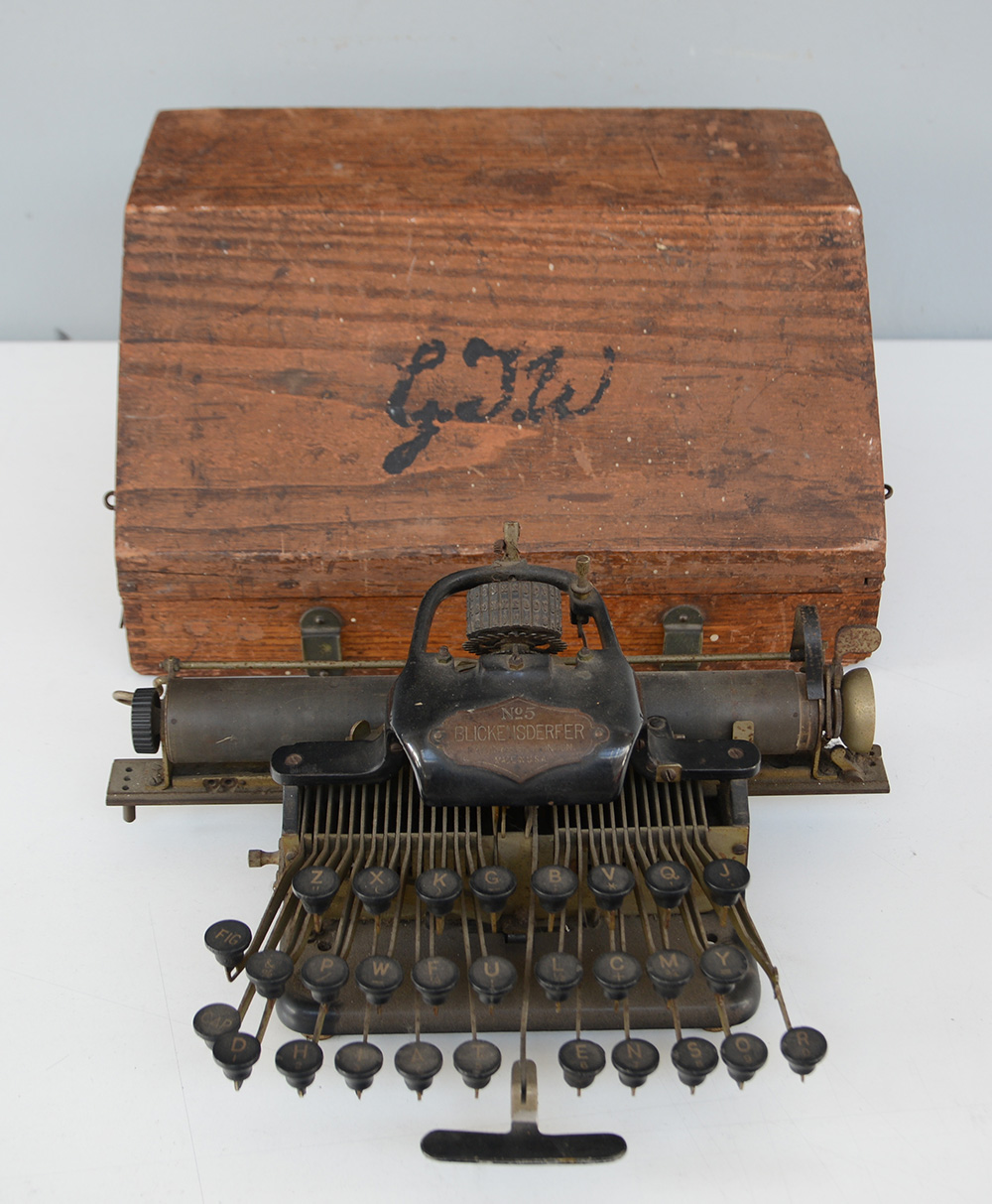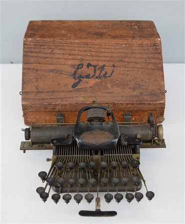Macchina da scrivere portatile "Blickensderfer, n°5" in custodia di legno. Prima metà del secolo XX (difetti e mancanze)