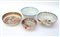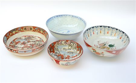 Lotto di quattro ciotole in porcellana policroma con decori vari (d max cm 25) (difetti)