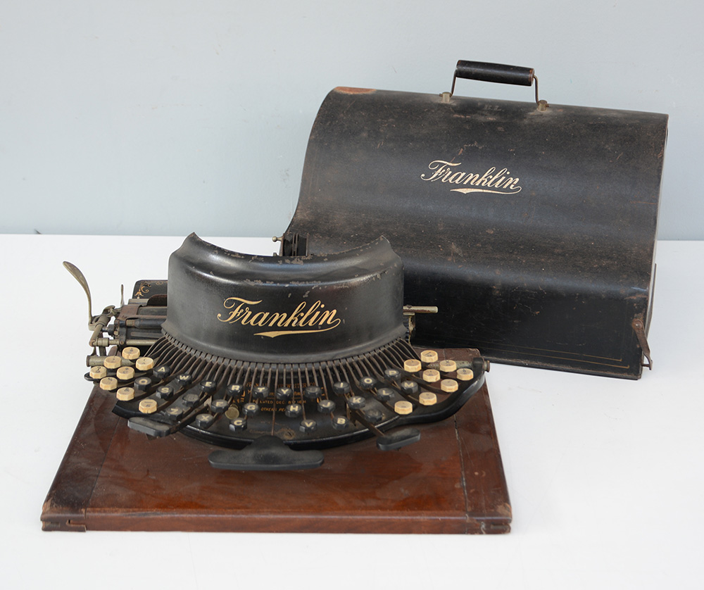 Macchina da scrivere "Franklin" in custodia originale in ferro e legno. Prima...