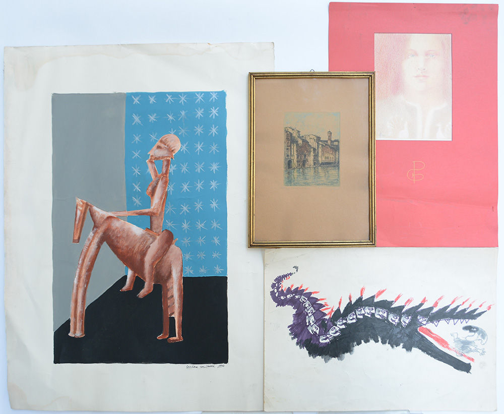 Lotto composto da un acquaforte a colori firmata Bartoli e una cartelletta contenente tre tecniche miste moderne, di autori e misure diverse