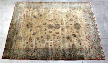 Tappeto orientale di moderna manifattura, decorato con motivi floreali nei toni dell’azzurro, verde e rosso su campo beige. Bordura a fondo verde (cm 321x242) (difetti e macchie)