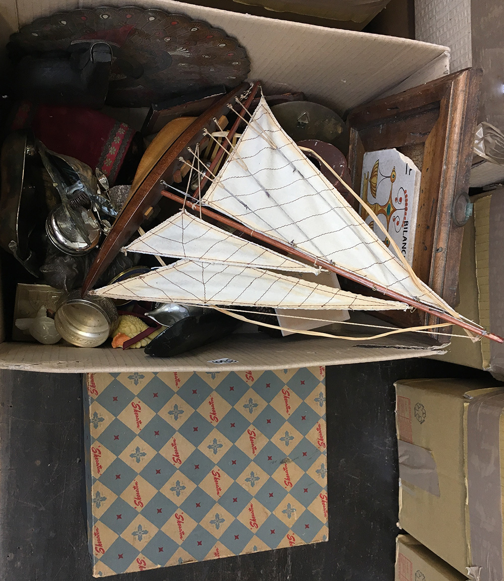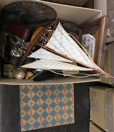 Cartone contenente numerosi oggetti, principalmente souvenir (difetti)