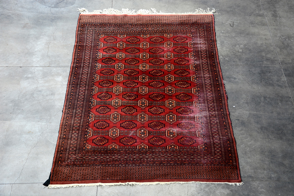 Tappeto Boukhara Pakistan, secolo XX. decoro a Gul su fondo rosa carico (cm 277x191) (difetti e rapature)