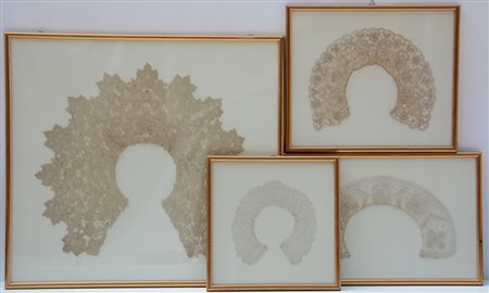 Lotto di quattro colletti realizzati in pizzo di cotone al tombolo. Fine secolo XIX - inizio secolo XX. In cornice (lievi difetti)