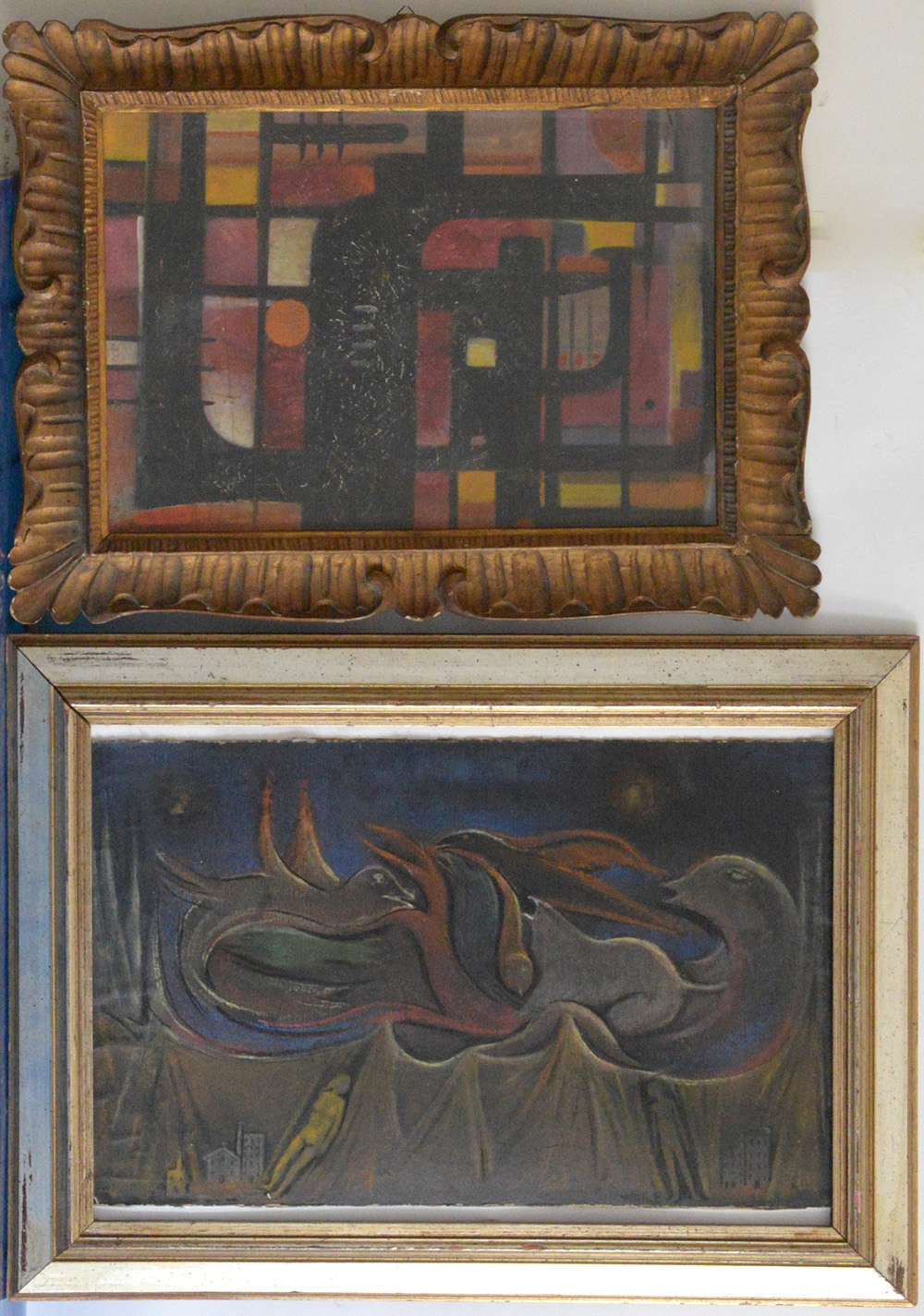 Lotto di due tecniche miste su cartone, autori e misure differenti, in cornici (difetti)