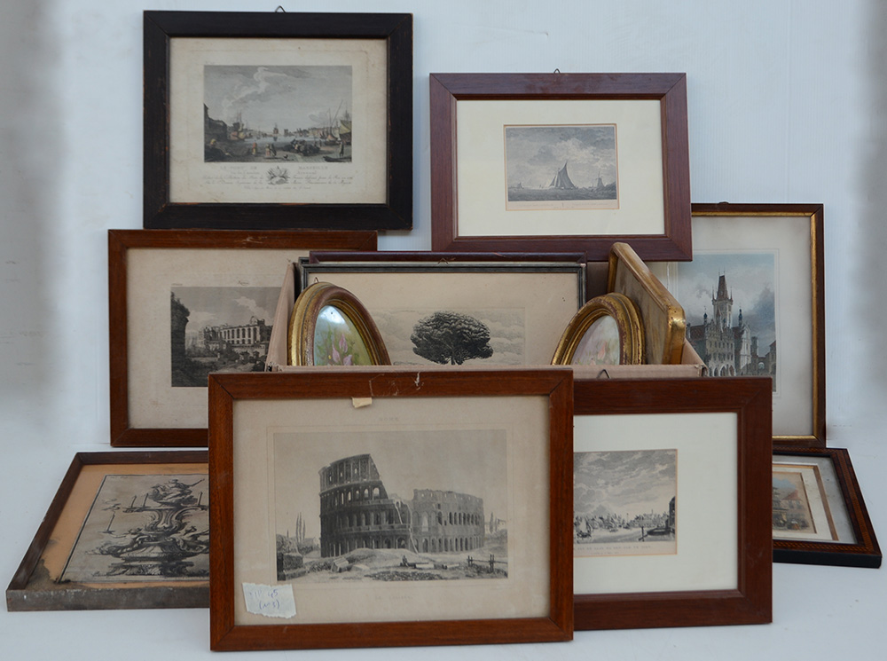 Cartone contenente numerose stampe di autori e soggetti diversi, in cornici (difetti)